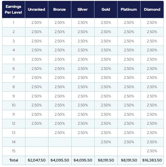 Example: If the company does $20m in revenue for the month between memberships, affiliate fees, and product sales, the Crown Diamond pool would have $100,000 in it (0.5% of $20,000,000). If there were 5 qualified Crown Diamond ranked Affiliates that month, each would get a $20,000 share of the pool ($100,000 divided by 5 Crown Diamonds) on TOP of ALL other commissions!